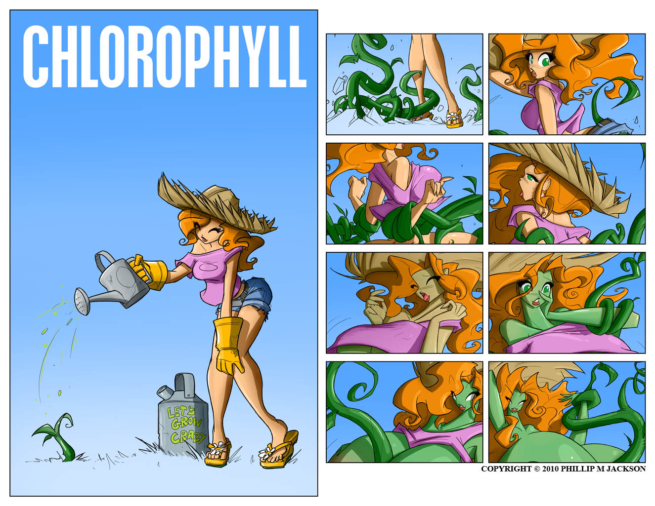 (Adult content/TF/Growth) A 9 image sequence in which a gardener gers a green thumb.... and hand.... and arm..... back..... legs..... head....