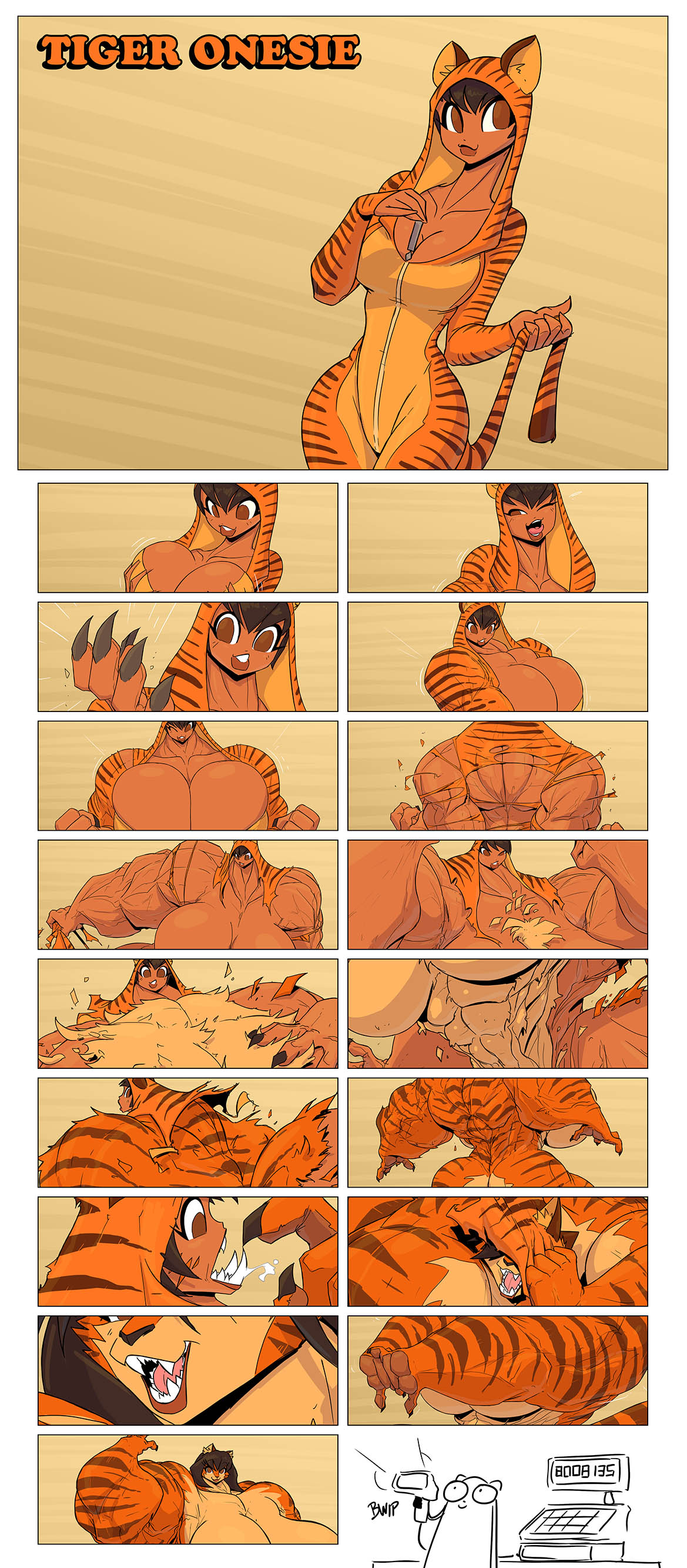 (Growth/TF/FMG) An 18 image sequence in which a tiger-themed onesie has a transformative effect on the wearer.